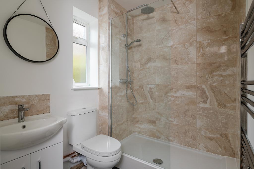 The refitted bathroom has been completed to a high standard, featuring a contemporary three-piece white suite with a walk-in shower and luxury tiled surround.