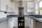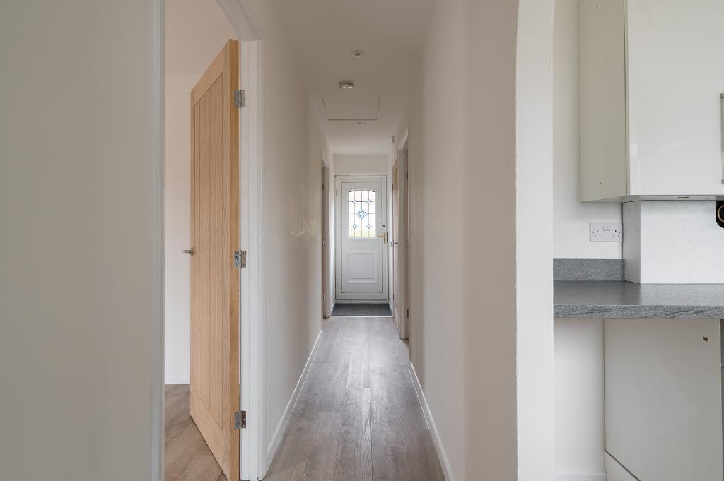 The modern kitchen, located on the opposite side of the hall, is fitted with sleek white cabinetry, contrasting laminate worktops, and a new cooker, offering both style and practicality.