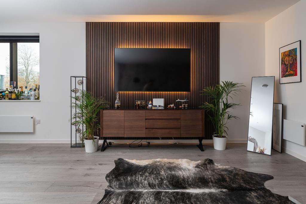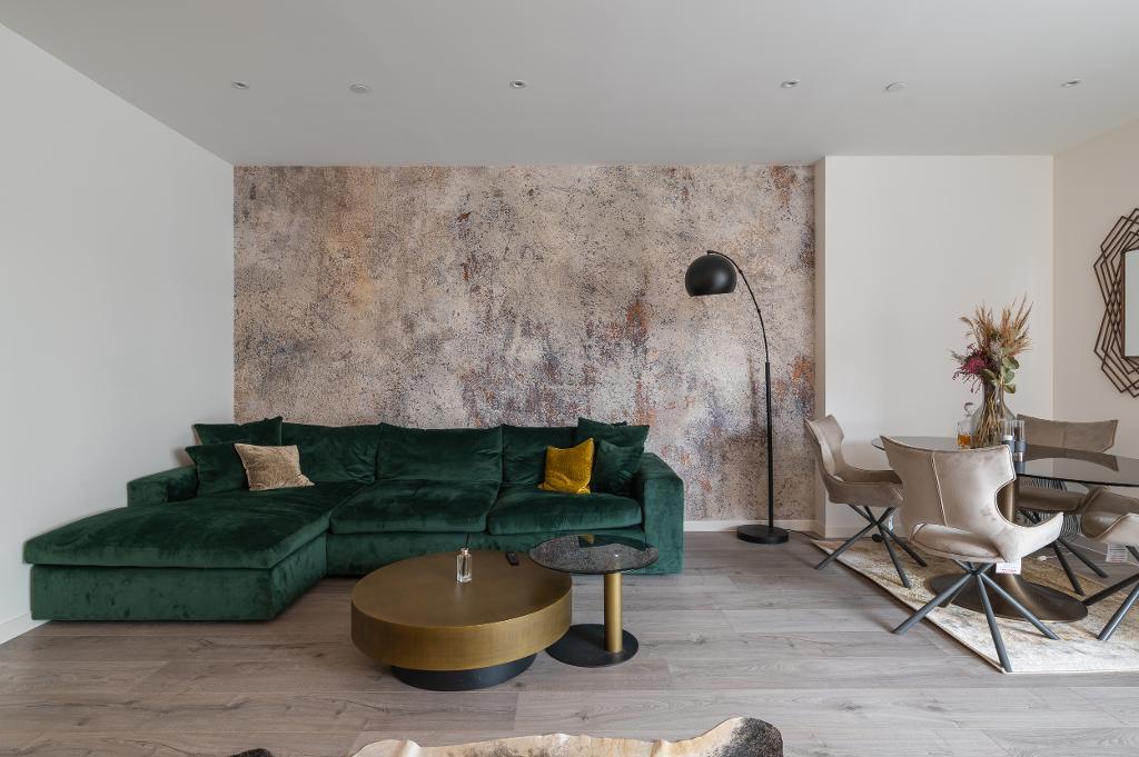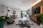 Positioned on the first floor, this stylish home features an impressive open-plan living space extending approximately 40 feet from front to back. High ceilings enhance the sense of light and space, with large windows allowing natural light to flood the room.