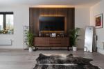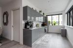 The contemporary kitchen is fitted with sleek, high-gloss cabinetry, integrated appliances, and elegant slimline stone worktops in neutral, modern tones - perfectly combining style and functionality.