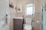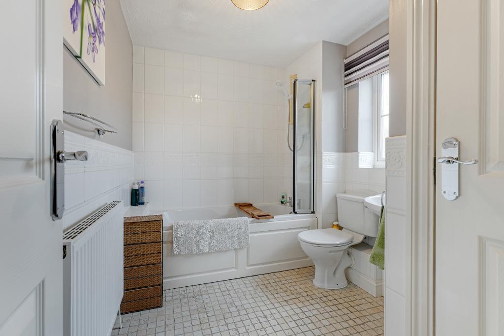 Upstairs, the first floor comprises three well-proportioned bedrooms and two bathrooms. The principal bedroom is a generous double, complete with triple fitted wardrobes and an en suite shower room finished with contemporary tiling and a sleek three-piece suite. The second bedroom is another spacious double with ample fitted storage, while the third bedroom, currently used as a home office, would also make a comfortable single room, again benefiting from built-in wardrobes. A modern family bathroom serves bedrooms two and three.