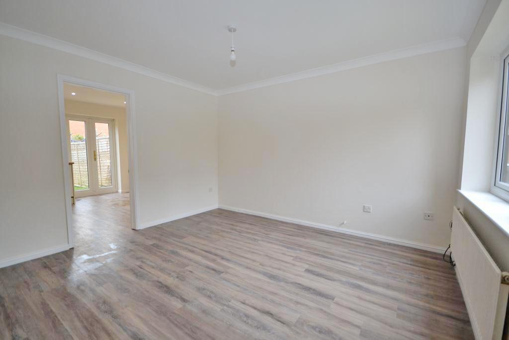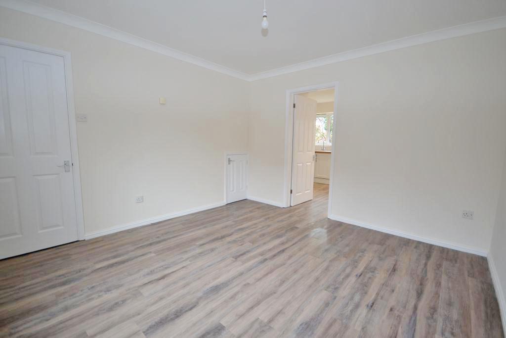 The entrance hallway, with a convenient ground floor cloakroom, leads to a generously proportioned living room benefiting from a large front aspect window and seamless, newly laid, Karndean flooring that extends into the kitchen dining room. Positioned at the rear, the kitchen offers ample space for family dining and is enhanced by patio doors opening directly onto the garden. The kitchen is fitted with shaker-style cabinetry, wood-effect laminate worktops, and tiled splashbacks with new kitchen downlights, creating a warm yet modern aesthetic.
