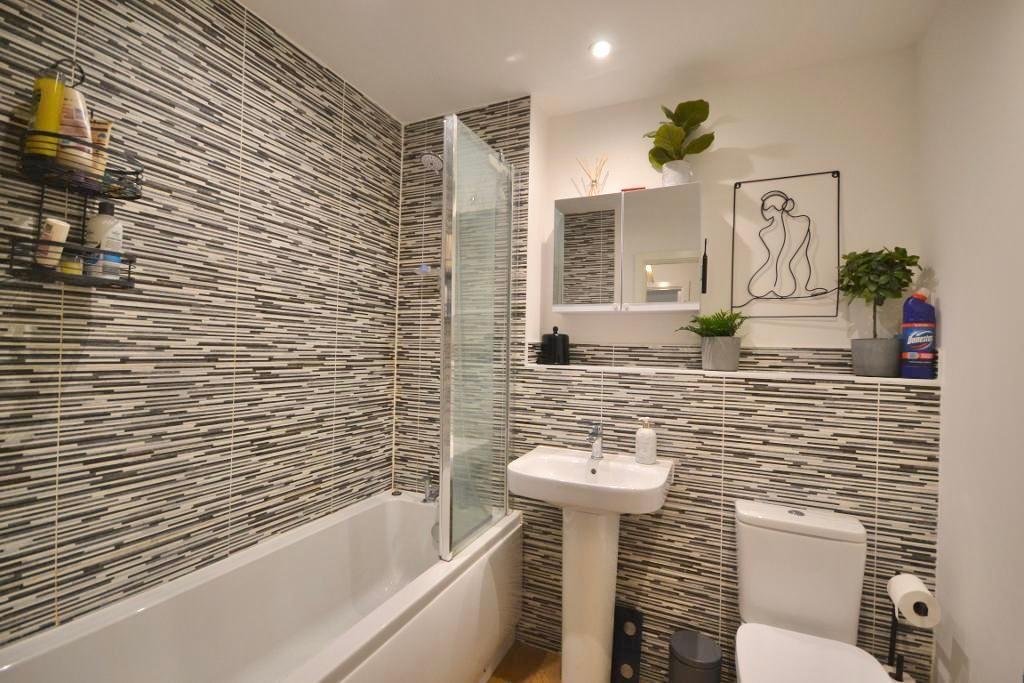 The apartment boasts a well-proportioned double bedroom complete with integrated mirrored wardrobes, a contemporary family bathroom with a shower over the bath, and ample built-in storage throughout.