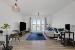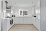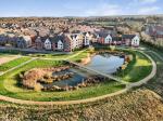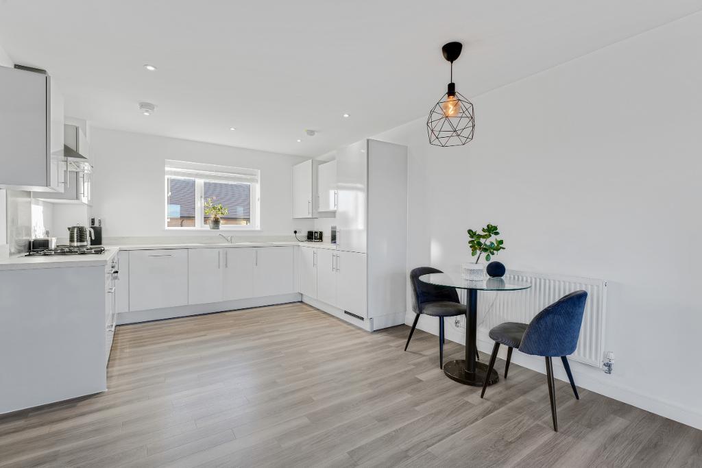 The true heart of the home is the open-plan living, kitchen and dining area. This bright and welcoming space benefits from a dual-aspect layout, allowing an abundance of natural light to flood the room. The kitchen is well-equipped with fully integrated appliances, ample storage, and generous worktop space, seamlessly flowing into the living and dining area. The room is finished with hardwood flooring throughout and further enhanced by a Juliet balcony overlooking a picturesque pond, providing a pleasant outlook.