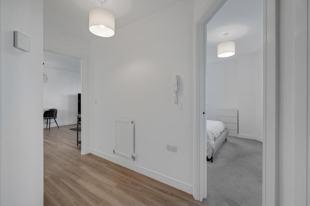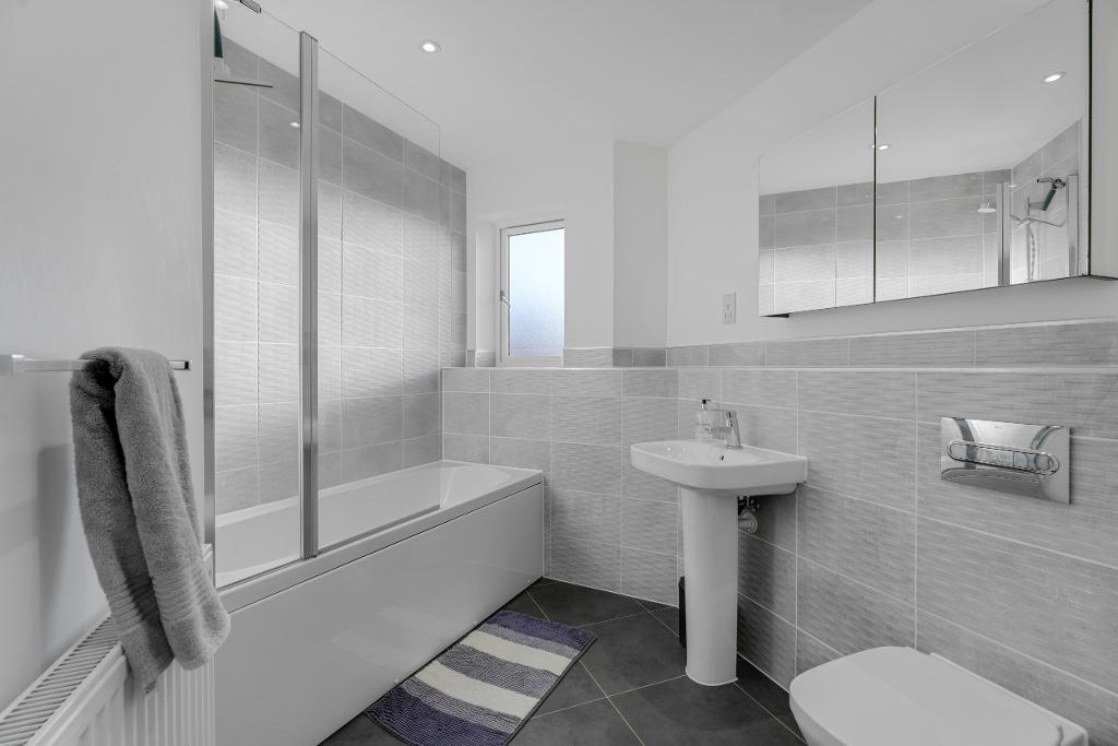 The accommodation is accessed via a spacious entrance hallway, which provides access to all rooms within the apartment. The property boasts a generous double bedroom, offering ample space for wardrobes and additional bedroom furniture. The modern family bathroom is finished to a high standard, featuring a shower over bath arrangement and stylish contemporary grey tiling throughout.