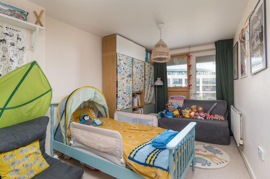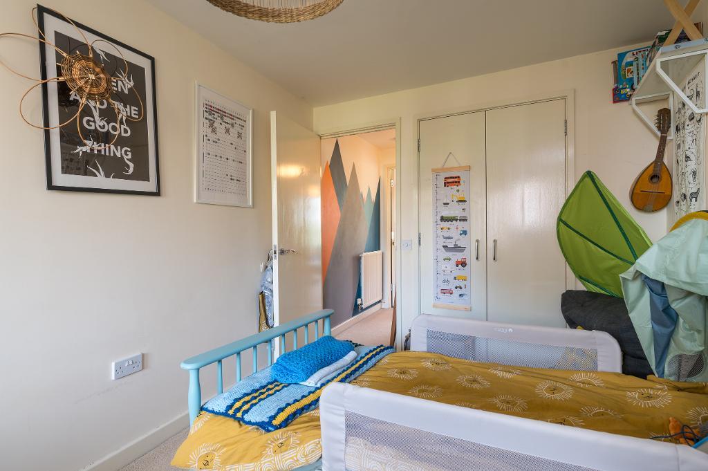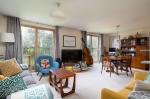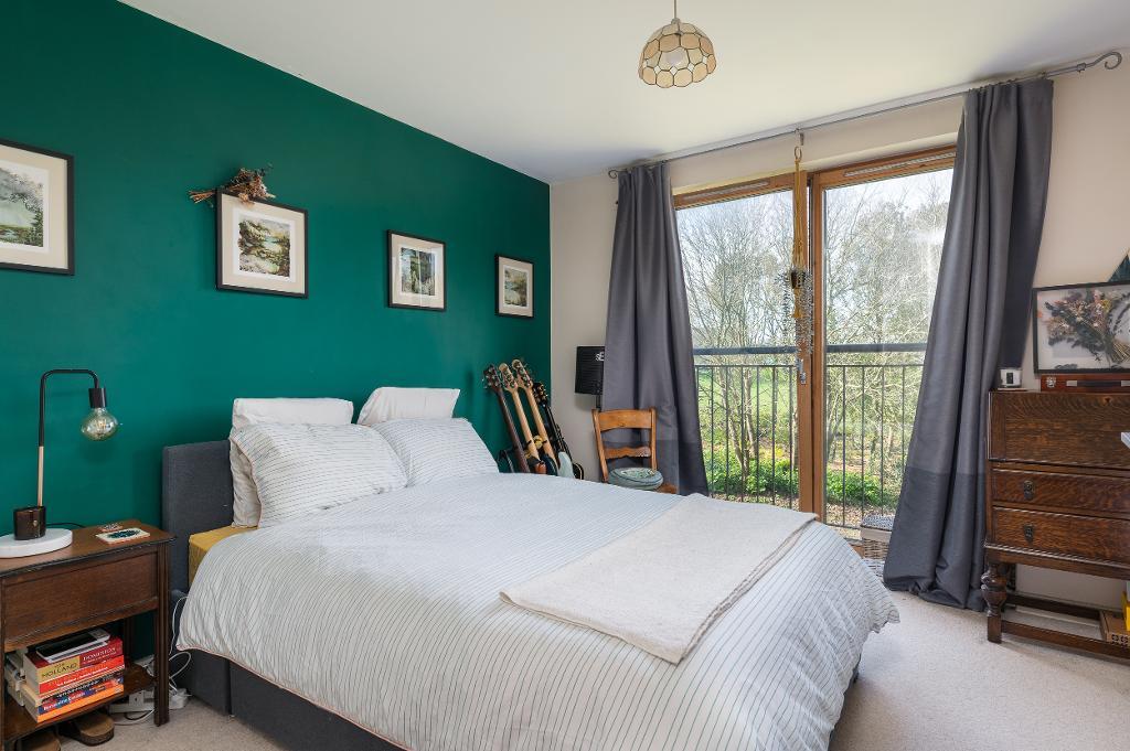 Stairs lead down to the lower floor where an inner hallway connects the principal living areas. The main bedroom is a beautifully presented large double room with fitted wardrobes, and enjoys direct access to a spacious balcony, offering the perfect spot to relax with a morning coffee while overlooking the landscaped communal gardens.