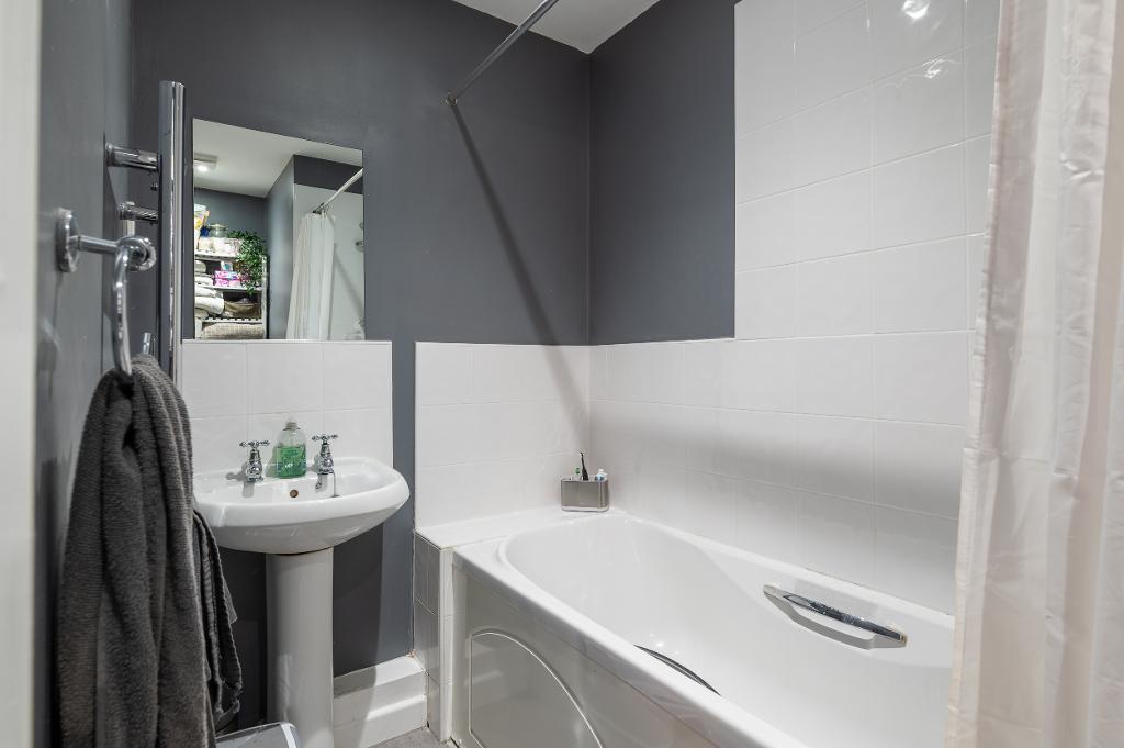 The apartment welcomes you with a spacious entrance hall, complete with large built-in storage cupboards; ideal for coats, shoes, and everyday essentials. From here, the hallway provides access to a modern bathroom fitted with a contemporary three-piece white suite, as well as a generous double bedroom featuring fitted wardrobes and a charming Juliette balcony, allowing natural light to flood the space.