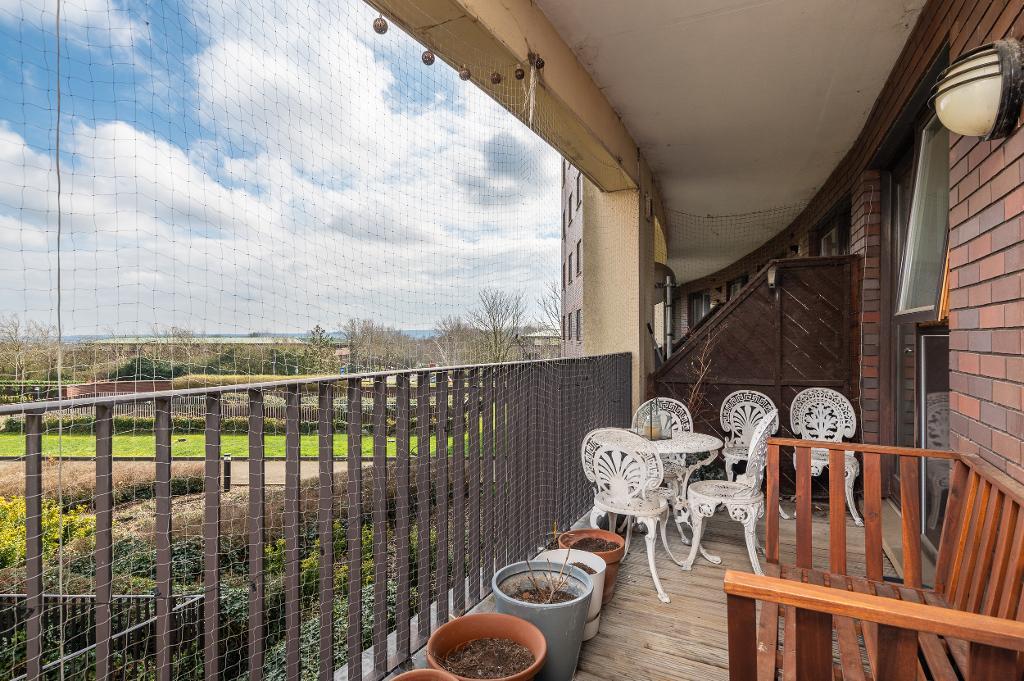 Leading from the living room, a further hallway takes you to the kitchen and breakfast room, designed with sleek stainless steel cabinetry, wooden worktops, and a stylish metro-tiled splash back, creating a modern chef-inspired feel. From the kitchen, a door opens onto the large balcony overlooking the beautifully maintained communal gardens, enhancing the indoor-outdoor living experience.
