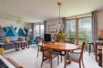 The living room forms the heart of the home, an impressive and light-filled space featuring two sets of floor-to-ceiling windows with views across greenery. The room provides ample space for both comfortable lounge seating and a dining area, making it ideal for both relaxing and entertaining.