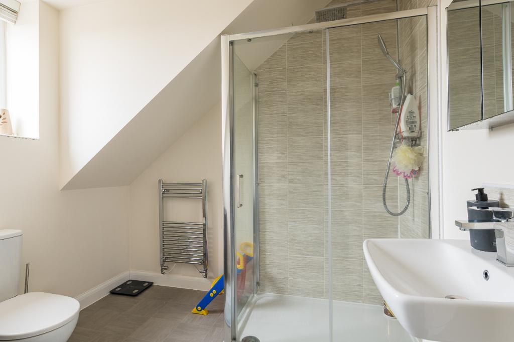 The first floor comprises three well-proportioned bedrooms and a beautifully refitted family shower room, finished in contemporary grey tiling with a sleek, modern suite. Bedroom two benefits from fitted wardrobes.