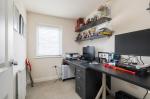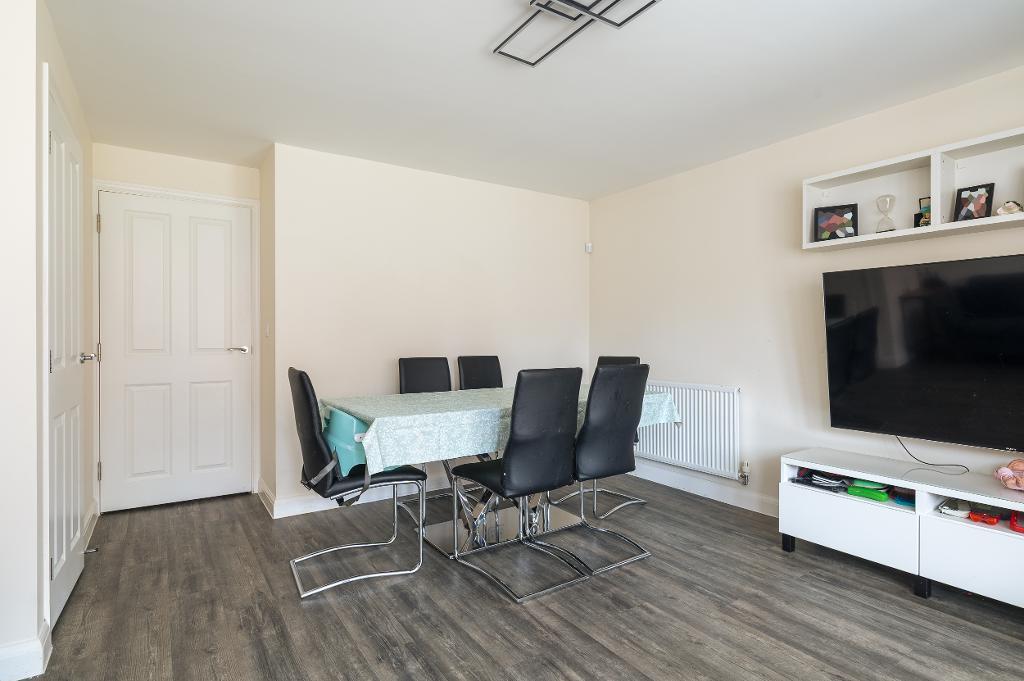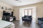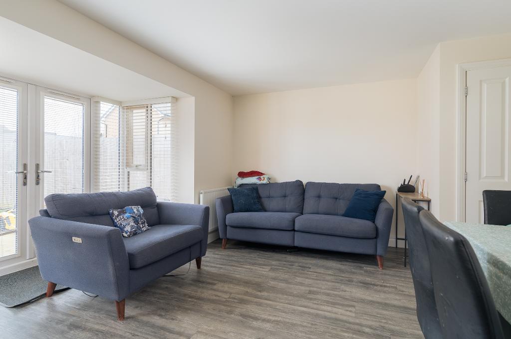 To the rear, the bright and spacious living/dining room offers excellent versatility for both relaxing and entertaining. A large bay window with patio doors floods the space with natural light and opens directly onto the rear garden. Quality flooring enhances the room, while useful understairs storage adds practicality.