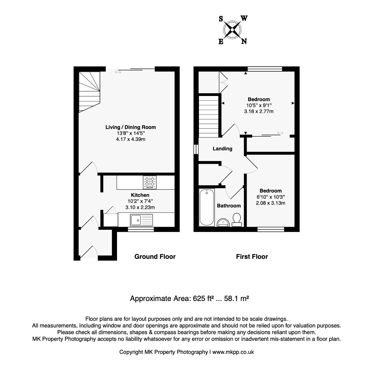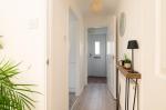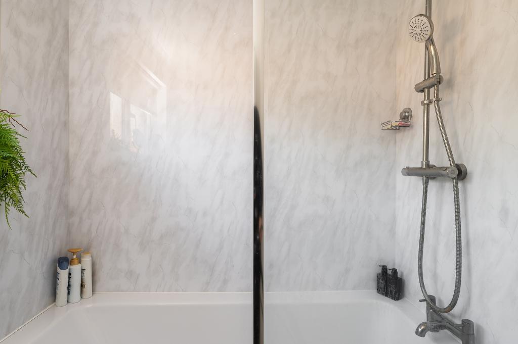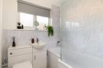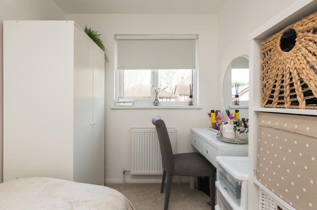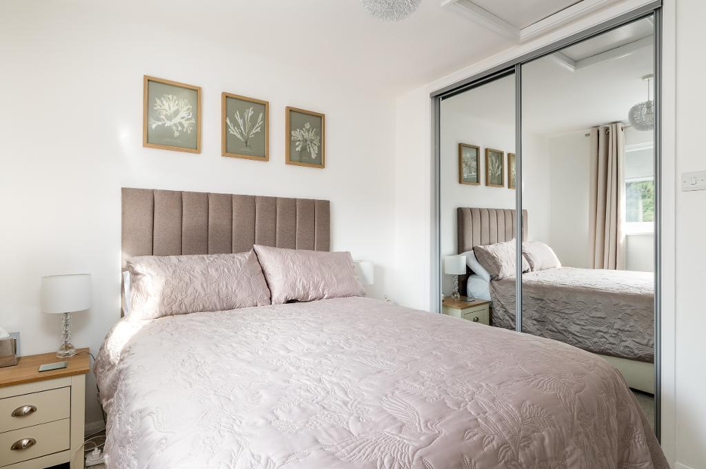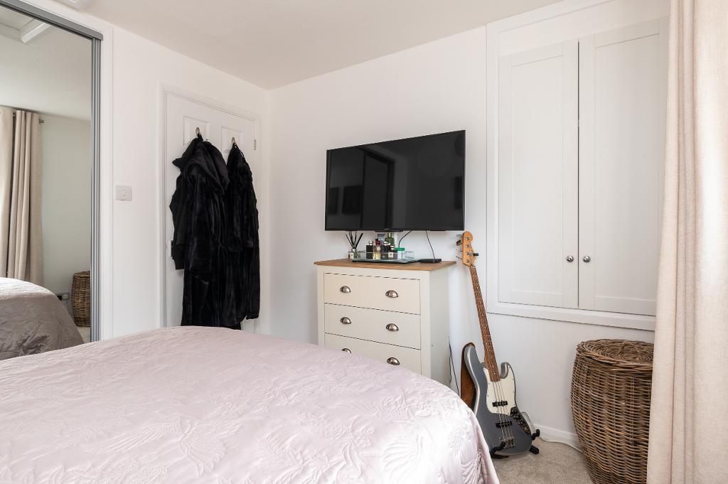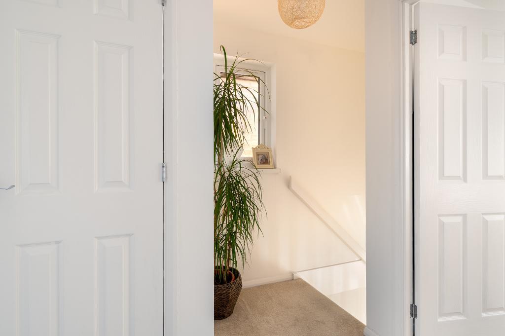 Upstairs, the light-filled landing offers access to a handy utility/storage cupboard and two well-proportioned bedrooms, with the principal bedroom benefiting from built-in wardrobes. The floor is completed by a modern family bathroom featuring a contemporary three-piece suite.