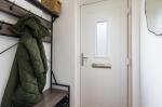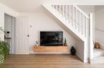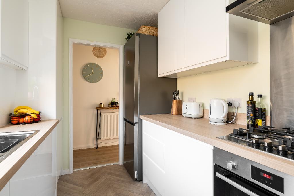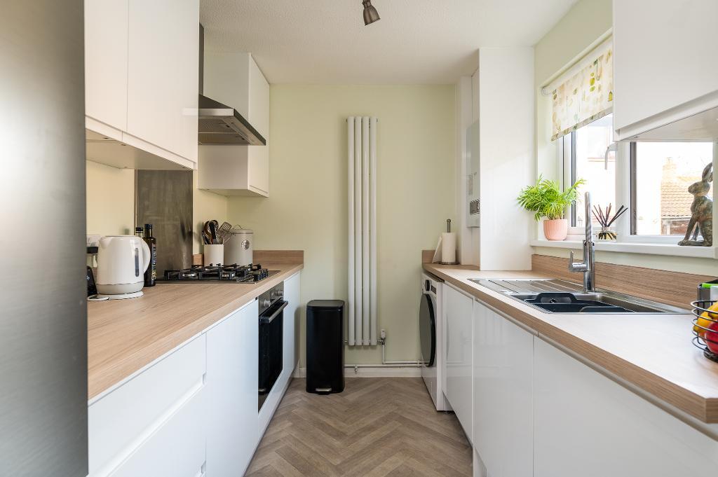 The accommodation begins with a welcoming entrance porch, complete with a useful cloak cupboard, leading through to the ground floor living space. The stylish, contemporary kitchen is fitted in sleek gloss white units complemented by wood-effect worktops and modern flooring, creating a bright and practical space. To the rear of the property, the spacious living/dining room provides a comfortable setting for both relaxing and entertaining, with patio doors opening directly onto the landscaped rear garden.